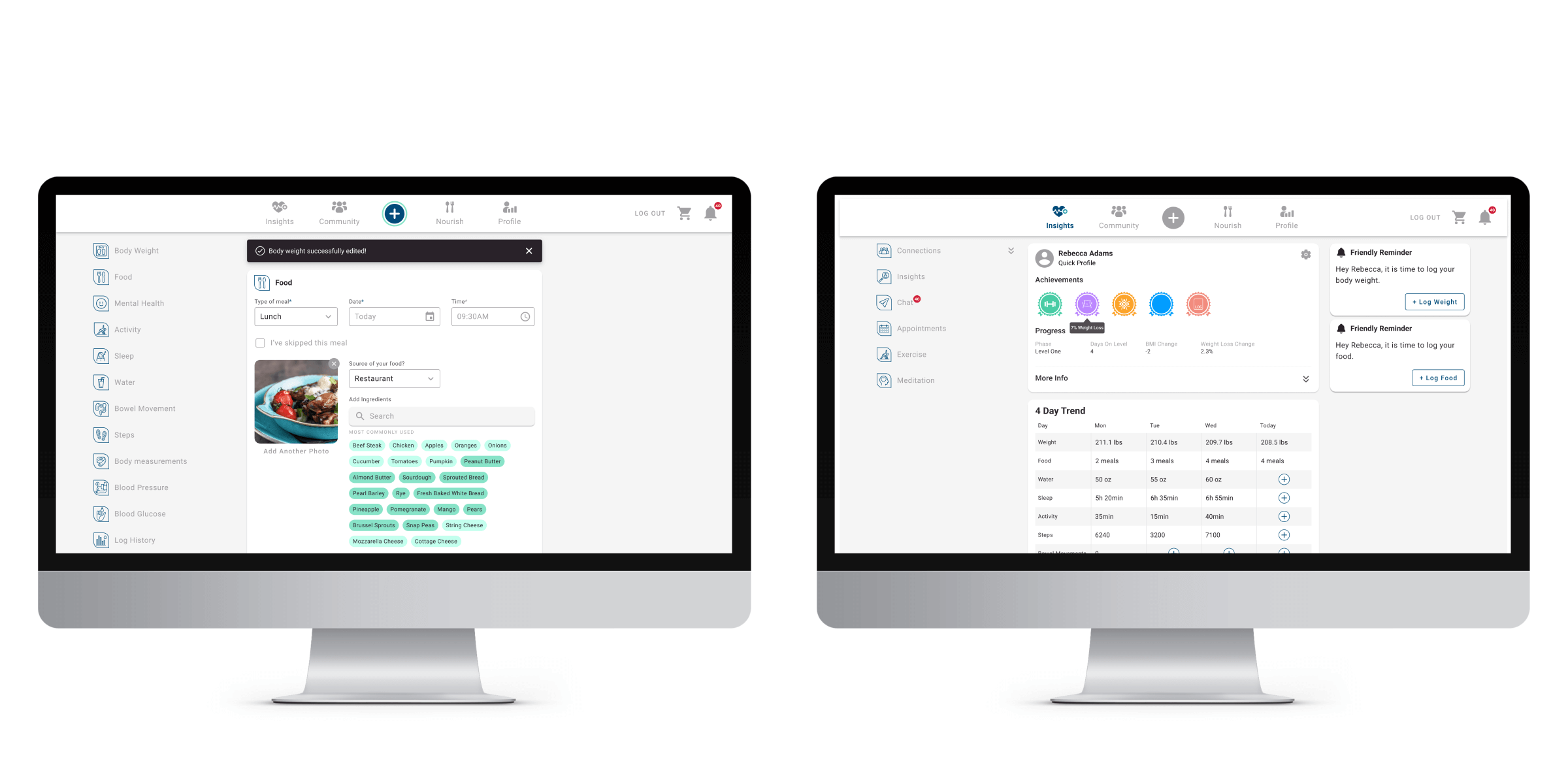 - Great user-friendly data logging and capturing system (Weight, Sleep, Food, Water, Steps)